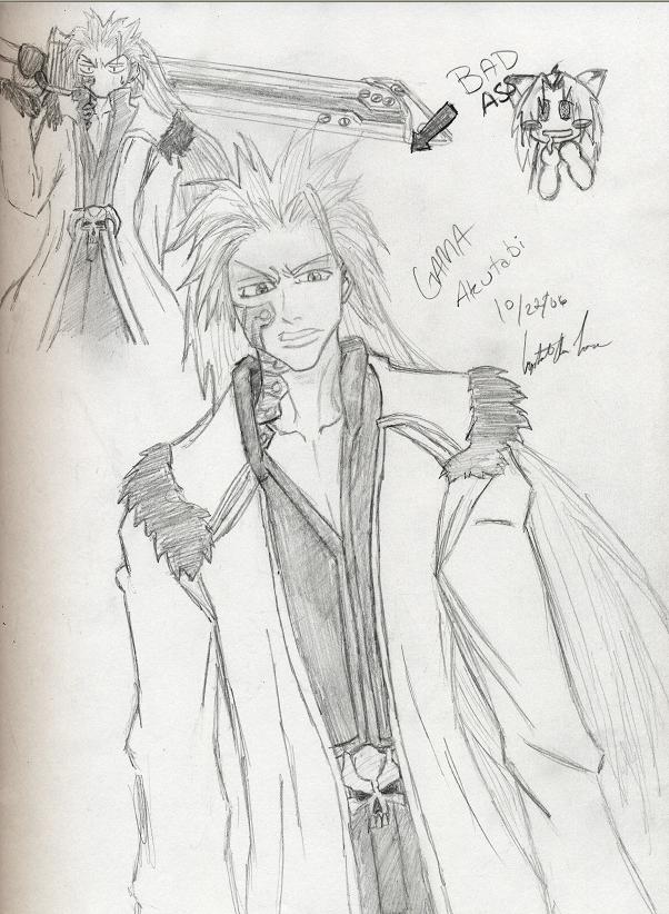 just another one of my late night doodles XD i had to doodle him sooner or later cause he's awesome XD X3 YAY BISHIE!!! =3 he kinda reminds me of Vash/Renji/Ichigo in one XD anywho, didnt spend alot of time on this cause it was like... 3 am XD so it's very sketchy srry it got smeared a bit too Gama Akutabi (c) Bleach creator sketch (c) meh >=3 ps i might color it later =3