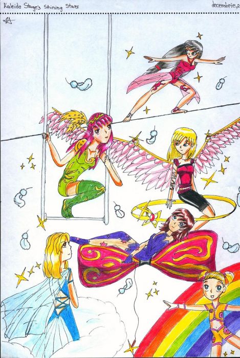 I think this is the best KS fan art I've done up to now, with the pencil set that's almost gone ^_^; I drew Layla (blonde girl, right, middle) from my memory, in the outfit she wore in the "Legend of Phoenix" OVA. The wings are made up by me. Sora (pink-haired girl) has a new costume! This was my imagination only, and I like how she turned out. Sarah (blonde girl, left, down) is the "dive of the stage" (she always sings during shows), and always wears angel-like outfits. So for this picture, she will be wearing a Greek goddess outfit ^_^ Rosetta (brown-haired girl, center) is supposed to be sitting on a diabolo. The fact that that thing doesn't look like a diabolo at all mustn't distract you though ^_^; Marion (blonde girl, bottom right) was the easiest to do. I didn't plan on drawing her at first, but I thought not many people draw her anyway and I decided to give it a try. Since she met Sora, she has been happy at almost all times, so I thought a rainbow would suit her personality. The only tools I used were my pencils, an ink pen, my scanner and Microsoft Paint (for resizing the image). Hope you like it, and thank you in advance if you view/comment/vote!