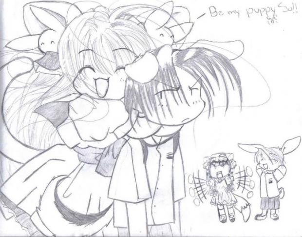 i wanted a drawing with misha hugging kotarou while koboshi gets mad at her and takashi just stands there and laughing at them ^.^