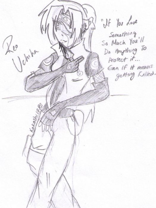 Yeah this is th sensei of my o.c....Sora...this is Reo Uchiha...Sasuke and Itachi's older sister (dont ask). i'll have the other two teammates up soon...hope u like^^ oh and the Quote says 'If you love something so much, you'll do anything to protect it..even if it means getting killed.' if u can read my writing then u deserve a round of aplause!