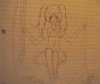 Just a recent drawing of mine. Nothing too special. I only did it out of boredom. XD Anywho, sorry the qualities bad. My scanner's broken and i had to use my Webcam, so the entire drawing isn;t showing. >