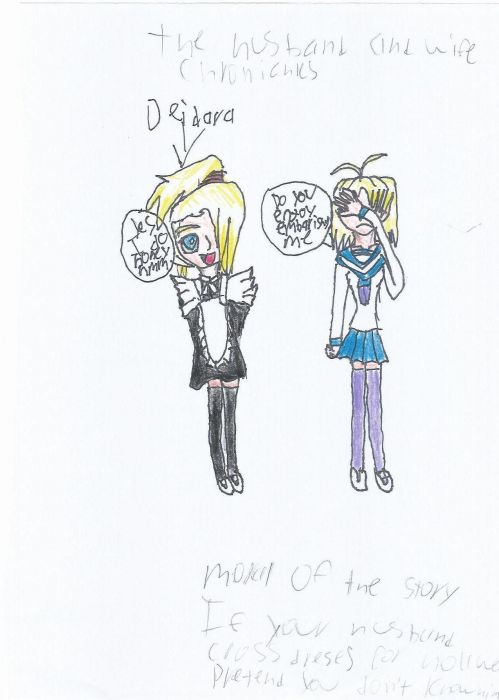deidara as a maid cafe style maid. xd. with my oc Mutsumi in a school uniform. all embarssed by her husband(yes husband) strange cross dressing behavior in this pic. so enjoy xd