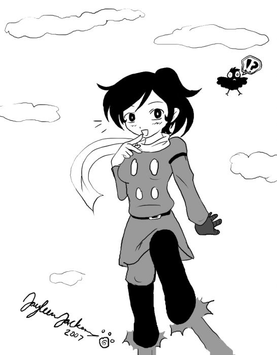 This has to be my best work yet! I drew myself C009 style for a poster I'm going to hang up in my room. I think it's simple and cute and it'll look great posterized. May I point out the disturbed, poorly-drawn bird in the background? I think it's adorable =^w^= You can tell who's powers I stole huh? I'm guessing they want them back..... ^^;