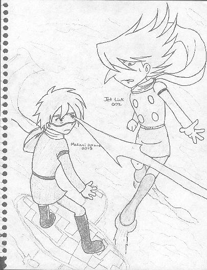 This is also kind of hard to see. I know but at least most of it was already inked before I took the picture. This pic took the most work all because of 002's nose. I had so much trouble drawing his nose just right and boy did it take forever :( If you want to know what's going on, my cyborg OC 0015 (a.k.a. Makani) decided to pick a fight with 002 (a.k.a. Jet). In this pic 0015 reveals his ability to Jet and luckily he just barely moved out of the way in time. If he hadn't seen it coming Jet would have been fried by 0015's laser beam! o_o I actually went for the 009 style with this drawing so that's why their bodies are shaped strangely XD Once again, if my dad let's me borrow his scanner I'll post the scanned version of this pic and replace it. *Gah! My hand is in the way!