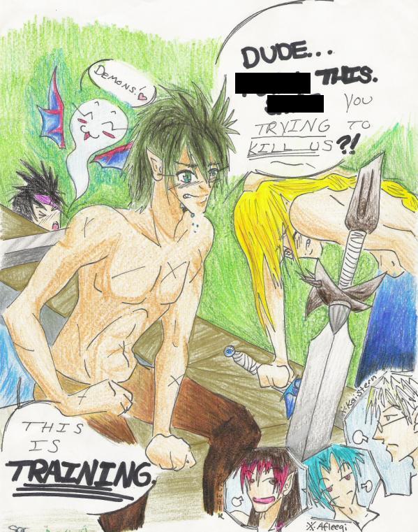 WARNING: LANGUAGE! But it's too late isn't it? XD I love Thatz XD SO! My first TRUE piece of Dragon Knights art :3 I am very happy XD. I was just thinking, in the book, they talk about training [vol. 10], but you never see it. Why? Because they pissed and moaned about it like Thatz did here XD. Right, so now my explanations of my crappy art XD. First time in a long while where I actually colored it the "Old Fashioned Way" [or even colored it at all and not on lined paper XD]. The fountain's rim, what Thatz is sitting on, was supposed to be gold. I tried to make it shiny. So wither you think it's gold or stone, I don't mind XD. And Rath's in the back only because once I finished Thatz and Rune, I had nowhere to out him XD. There's going to be another one, and it's going to be Ruwalk, Alfeegi and KaiStern in all their handsomely-aged-eye candy like-selves XD. I wish I could credit the person who I got all the info from, but I found the information a few years ago and no longer have the site. It was ALL Dragon Knights, and it gave you info on EVERYONE all from their personality to their eye color. Drawing reference: Volumes 1, 2, 3, 4, 10, 16, 18 & 21. ________________________ [c] Mineko Ohkami [c] me