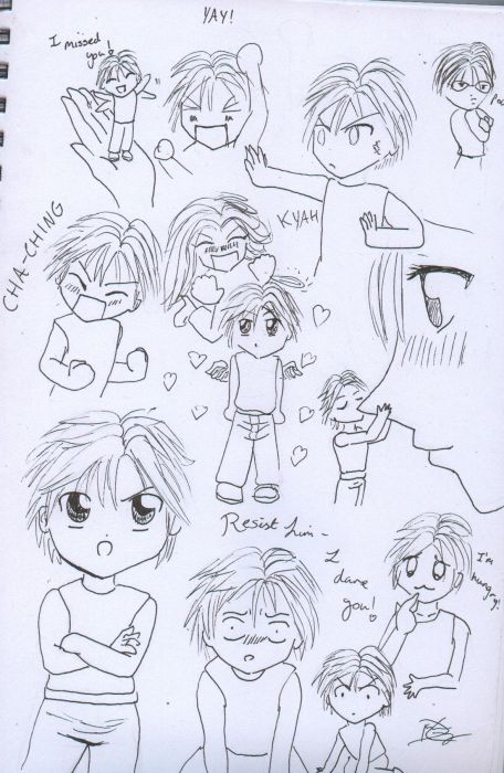 IT'S MINI NIGHT! That's 'mini' not 'chibi' from Volumes 4 and 5 of Absolute Boyfriend. How cute?! My new obsession. He's mine, I love him ^^ Yes that's Mini Me. and Mini Soshi pouting in the corner. and Big Riiko. Well, normal Riiko. Keep eyes peeled for coloured version.