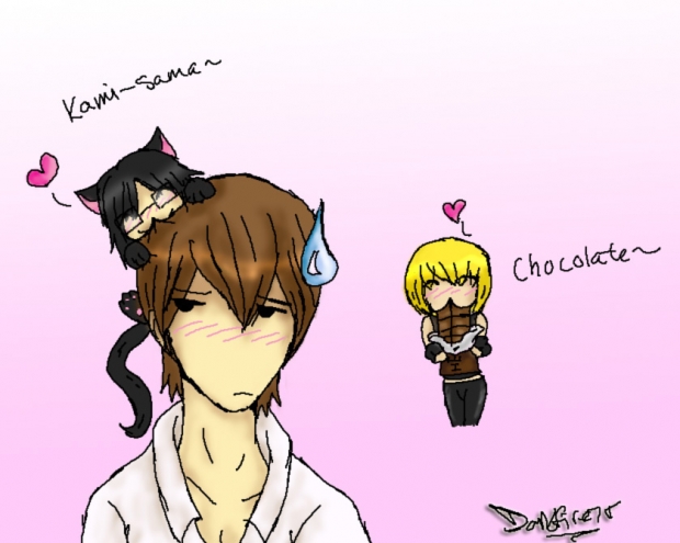 I like to eat my chocolate and MikaMika likes to turn chibi and climb on his Kami-sama's head XD