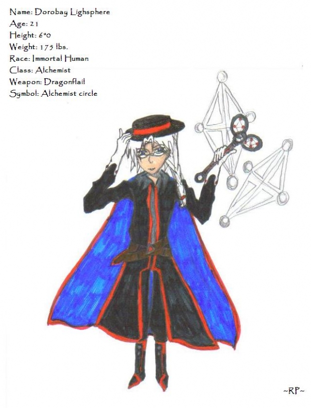 Next character from my new story, Tales of Infinity! Yay! Again, however, I think I made his legs too short. My sister and discussed that maybe they're all midgets. Then an inside joke was born once again... Anyway, I hope they don't look too short. Well, his name is Dorobay Lighsphere, an alchemist. And his weapon is a type of flail. Pretty cool, huh. Other than I think the colors are a bit too dark, so I colored his cape blue, but that didn't help much... Anyhow, I hope everyone likes him! ![]()