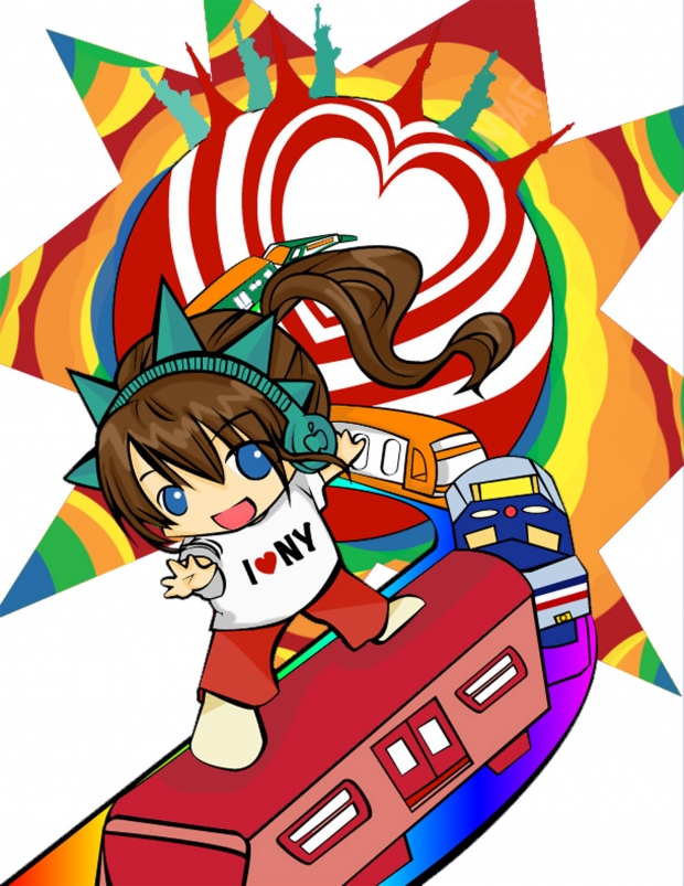 So New York and Japan are big cities and have nice little landmarks that everyone can point out! Statue of Liberty and Tokyo Tower!! Then on top of that they both have subways in common, so hence all the random subways! Red is a very asian color too and so that is why the girl wears red pants. The end. This was fun <3.