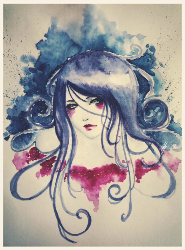 - blue, curls, red, seductive, swirls, traditional, watercolor