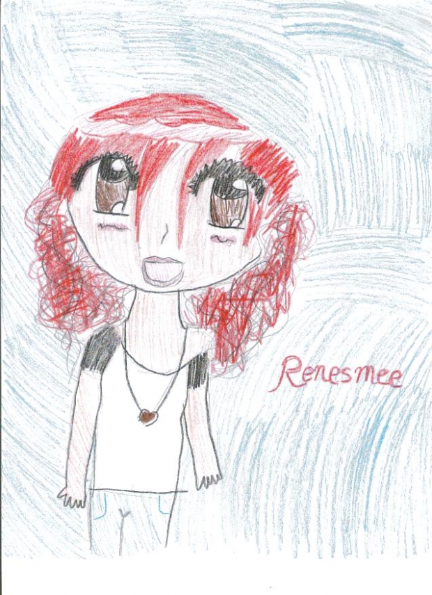 Renesmee is the half-human, half-vampire birth child of Bella and Edward. Bella gave birth to her during her being human, and Renesmee had hurt Bella so much, that Edward had to change her into a vampire. Renesmee can show people pictures in their mind by touching their necks. She can live off human food or blood, and actually has blood running through her veins.