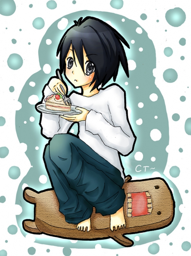 - cake, death, death note, domo, kawaii, l, note