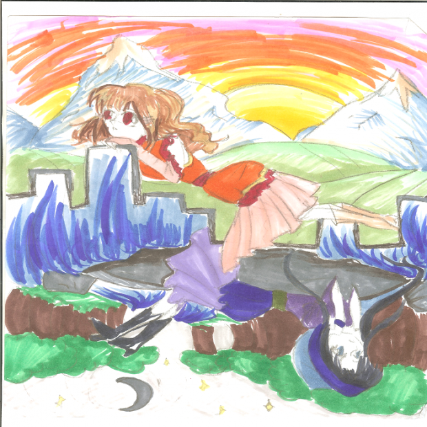 this is a weird one.... the characters are Dori and Ice from my self-made manga, "To Utter a Word and be Killed." Dori is the sun lady and Ice is sitting in a river during night.... I think it's pretty with all the different colors.