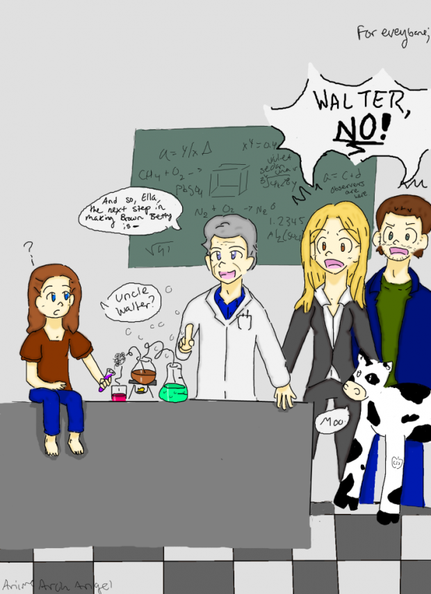 This is for someone over on Fringe-Forum, who agreed to do an art trade with me and made me an amazing avatar/banner set. This is my half of the trade, in which Walter is teaching Ella how to make Brown Betty, and Gene, Peter, and Olivia really aren't too happy about it.