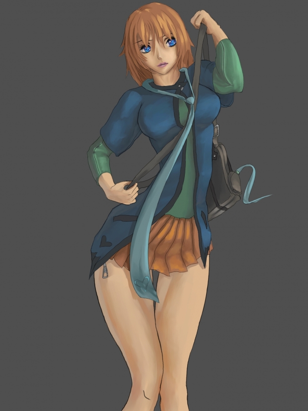 - bag, girl, hair, jacket, orange, school, skirt
