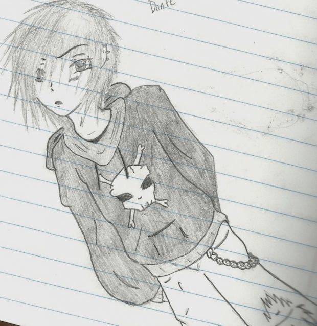 This is my Oc Dante from the Rp Toxic Waters ^^ I was really bored in my English/Writting class cause it's 3 hours long and all the teach does is talk! I look around and everyone's asleep...my buddy Batman falls asleep on my shoulder XD so one day I doodled a face and I was like oh Dante so I drew the rest of him ^^ and yes I know he's crooked >.>' I drew him sideways at the bottom of my notebook and this is as straight as my edit thing on my laptop goes hehe