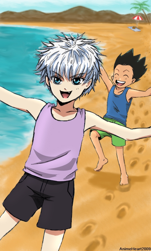- Basket, beach, blue sky, Gon, happy, Killua Zoldyck, Mountains, Palm, Umbrella