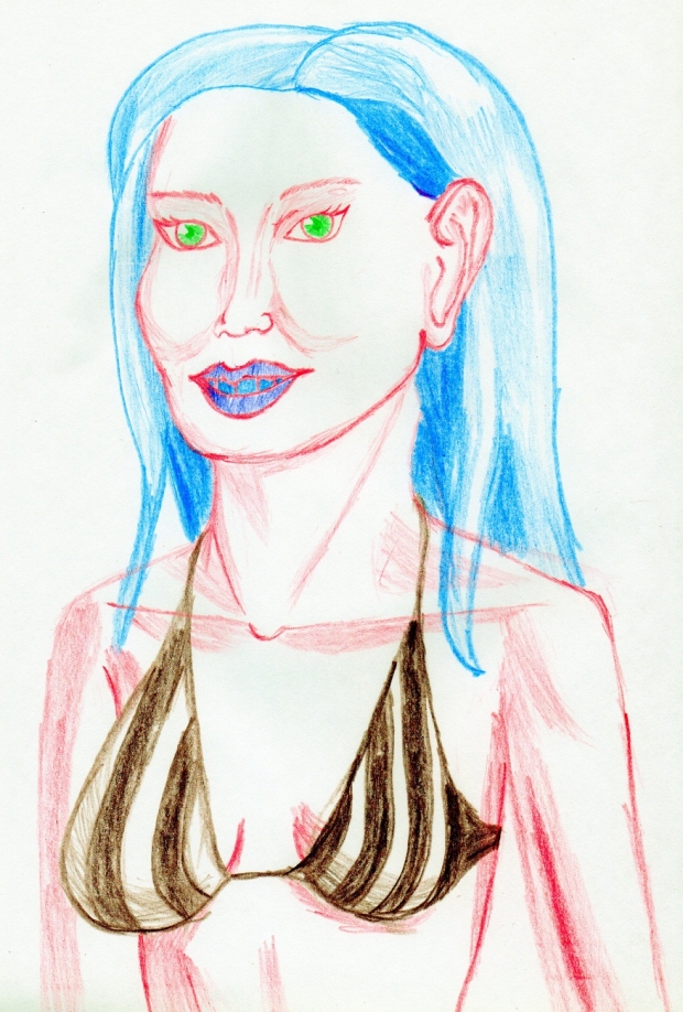 This is just a girl in a swim top. Her skin is red, her hair, lips, and teeth are blue, her swim top is brown, and, my favorite, her eyes are green.