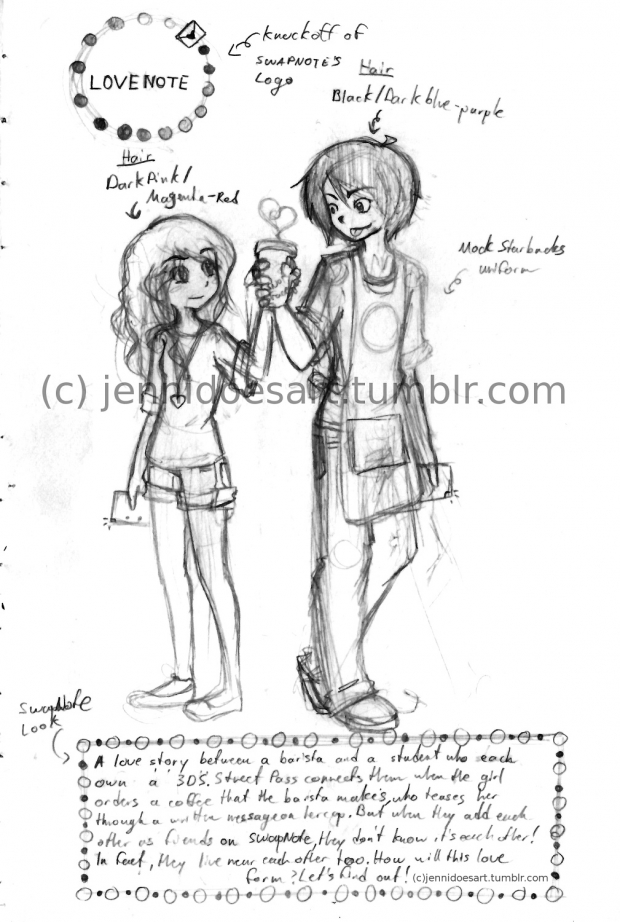 Plot and character designs for a one-shot shojou I’ll be doing this month I’ll be calling “LoveNote”. It’s about 2 people that aren’t very fond of each other in real life—they only interact through coffee orders— but they become friends through SwapNote after they pick up each other on Street Pass…but they don’t know who the other person is behind their Mii!