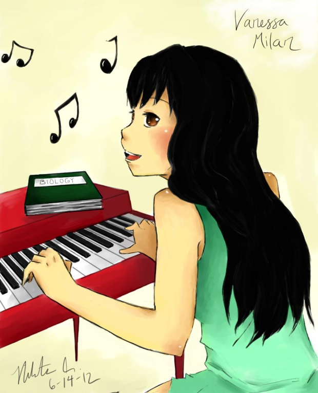 - bangs, biology, friend request, girl, long hair, looking back, music, piano