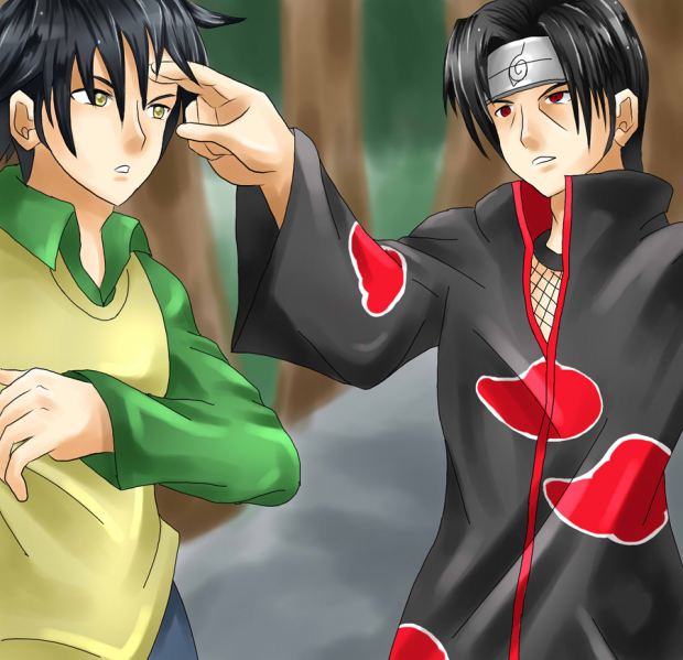 this is my second entry to the pay it forward challenge this one's for zuzu. as you can see itachi is poking zuzu's forehead with his two fingers something he usually does to sasuke.after spending so time with zuzu, itachi is having some nostalgia feelings about sasuke.
