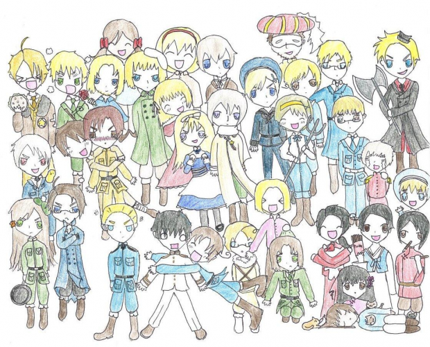 Ok let me just say this, I LOVE HETALIA! So this is a drawing of a bunch of the characters in Hetalia (it would be impossible to do them all!!!). I spent at least 4 days on it, Traditional Art