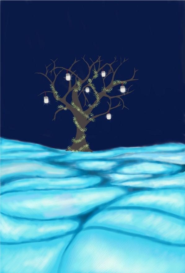 - bare tree, blue night sky, blue shadows, Christmas, glowing jars, jars, lights, night, red string, snow, tree, winter, yellow lights