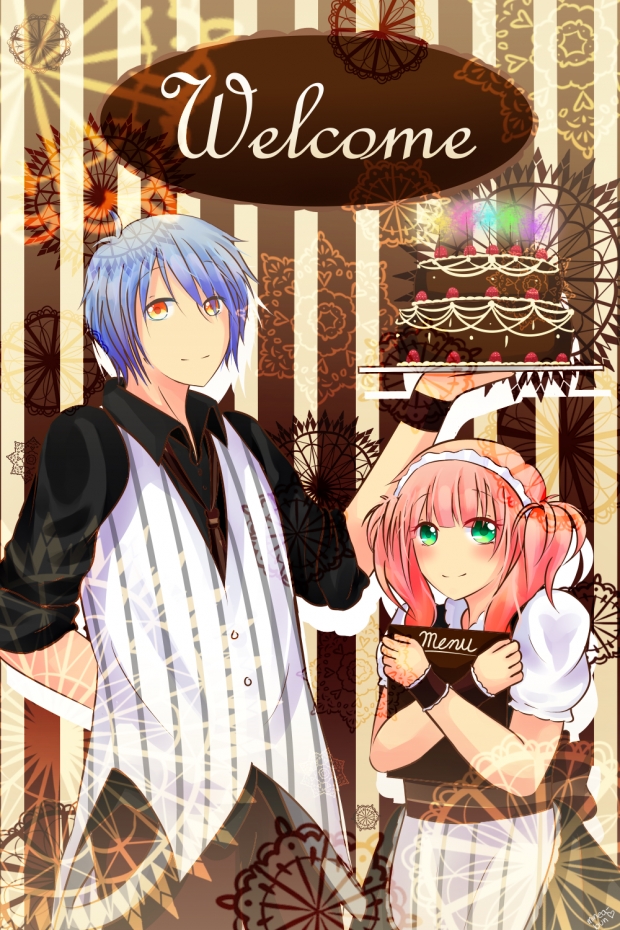 - anime, boy, butler, cake, chocolate, cute, girl, maid, sparkly, strawberries, waiter, welcom