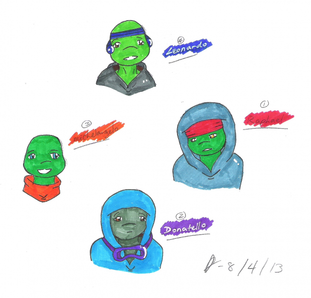 - aftermath, beginning of anew, donatello, donnie, donny, leo, leonardo, life, maskless, michelangelo, mike, mikey, novice, raph, raphael, tmnt, without masks
