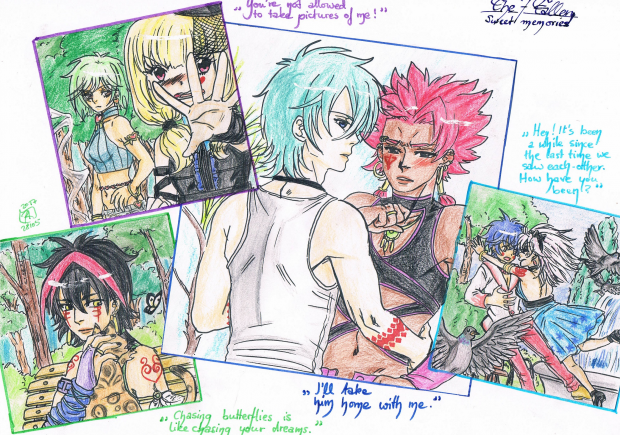My fallen angels again. Had been awhile since I drew them. They were drawn seperately, arranged on a DIN A4 and glued together. Was really fun to do it this way. Shihou is the first one to leave his past and clothes behind him. Unfortunately, his arm turned out wrong as well as the positioning of his tattoo. On earth, Hitoya picked up smoking, which came as a surprise to me, too, lol! I shouldn´t be, though... I´m looking forward to making their char-sheets. As for now, please enjoy this one! ![]()