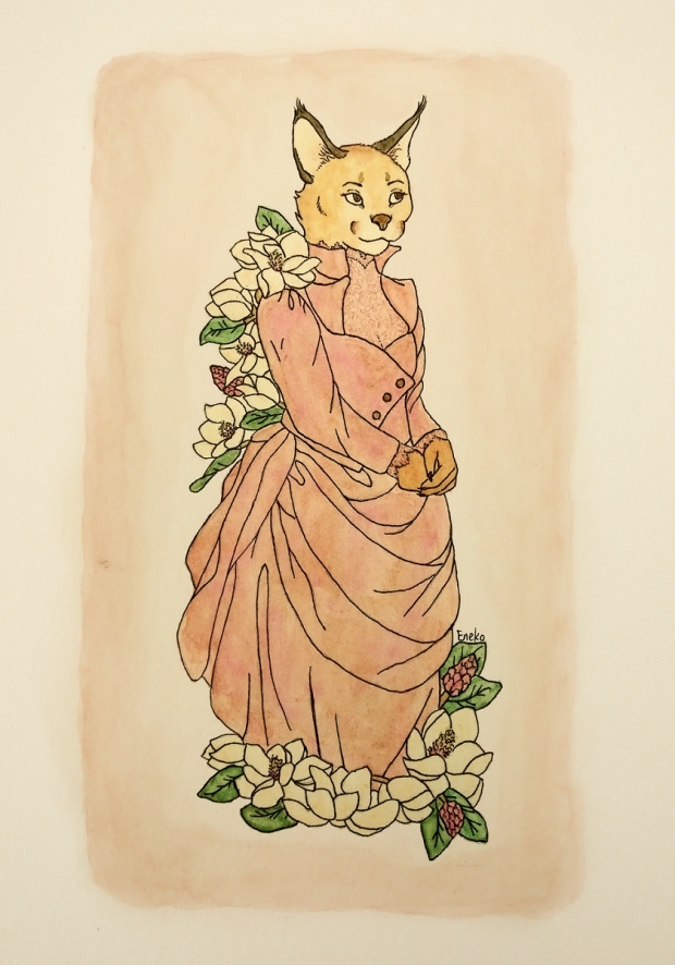 Painted a portrait of my caracal fursona, Mocha Brushtail, in an 1800s style bustle dress! Southern magnolia blooms for accent :3