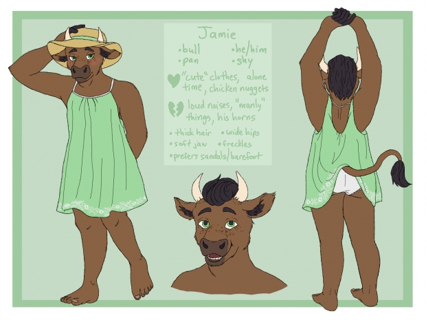 I got commissioned to draw a reference sheet of my friend's bull character, Jamie! I'm happy with how this came out. First time drawing a bull :D