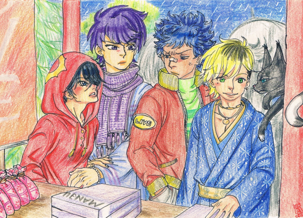 - akatsuki tagaya, anbu, cat, male, mizuno muon, oc, rain, takemoto taitou, temple, yamada shinrai