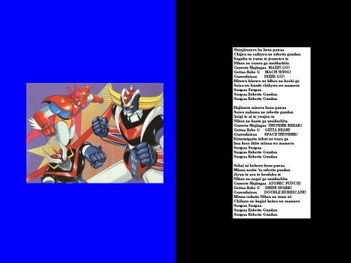 Featuring lyrics "Iza Yuke Robotto Gundan", the opening theme song of the 1976 Mazinger film "Grendizer, Getter Robo G, Great Mazinger: Kessen! Daikaijuu", performed by Isao Sasaki and Columbia Yurikago-Kai. Look for the movie on youtube! You'll have fun watching it!