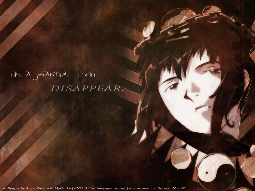 I really love how this turned out!! It's so grungy and dark, and just plain ol' awesome. XD At least, I think so right now. I'm almost disappointed that Boogiepop Phantom has a category...cause I'm sure no one checks it, and therefore, I'll get few downloads. Oh well. I think it turned out great, so there. Hopefully more people will see it. It's just a shame that a lot of GREAT wallpapers go unnoticed because it's not from a "popular" anime. Anyhoo... For pretty much the first time...ok, second, I used a pre-made texture. It's from aethereality.net, and I used it to overlay over the PNG and bg. It gives it a galaxy-sorta look. As for the PNG, I overlayed it with a black gradient to make it less saturated...I made the top texture layer "lighten" the bottom, so it looks like she's really disappearing into space. :3 I used some brushwork and motion blurs...glows...and more PS textures. Yes, sweetdevil, once you start on texture wallies, you can't escape!! XD Anyhoo, I think this turned out well. Hopefully someone else agrees. I haven't made a wallpaper in about a week, so I'm glad I haven't lost my touch. This took about an hour (probably). Enjoy!