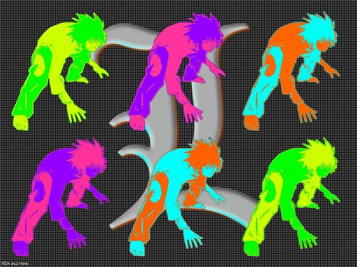 A wallpaper I made in Fireworks featuring L from Death Note, utilizing a style of Pop Art as made famous by Andy Warhol.