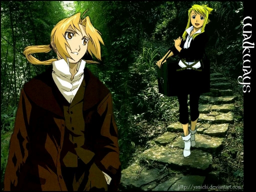 Many a year ago, 2005 to be exact, I created a wallpaper called Walkways (look here if you doubt me see ) and as I was at a very low skill level I was very proud of my piece. It was even fairly popular. My skills have somewhat improved since then, and so using the same background and merging them together, using the full shot of Winry and a new Ed image I present...Walkways II (celebration ensues)