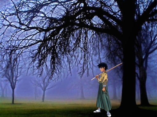 This is one that I created with a picture from the internet of a foggy forest and worked with it in Photoshop to make it look less like a photograph and more like a drawing. Then I pasted Yahiko in. Enjoy :)