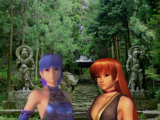 A wallpaper made with two promotional pictures for Dead or Alive 4 and a photography of a temple.
