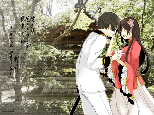 I found this cute picture of Japan and Taiwan from Axis Powers Hetalia on E-shuushuu.net and had to make it into a wallpaper. :D I paired it up with one of my photos from my travels in Japan. I don't really remember, but I think it's part of the Ginkakuji Temple. On the side I found a poem about cherry blossoms/love(I can't read Japanese,so I wouldn't trust me) to help match the feeling.