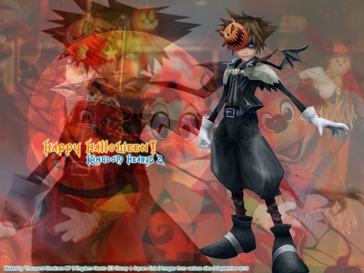 I'm starting to get into the Halloween spirit a little bit. To celebrate this year's upcoming Halloween, I decided to make this awesome Halloween themed wallpaper. Sora looks so awesome in his Halloween clothes and I think his pose is cool too. Halloween is a cool time a year and it's the only time you can get away with dressing up in costumes and collecting free candy lol. But anyway Halloween is fun because of all the pumpkins, black cats, ghosts, and other Halloween related stuffs. For my background I used Halloween themed images. I found this cool wallpaper of a crazy looking cat in the background and I put some other Halloween related images in the background too. I wanted to put Halloween Town in the background but I couldn't find any good images of it. Maybe I'll make another one of this that features just Halloween town, I don't know yet. I hope everyone likes it. Hope everyone has a Happy and scary Halloween(I know it's a little early lol) Dedicated to Angel Zakuro.