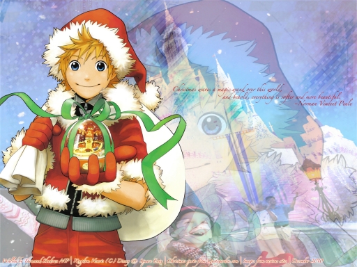 This is the first wallpaper I've made for a long while. I've just been so distracted lately with trying to get all of my work done and everything. I just couldn't seem to find the time to make any new wallpapers. I really wanted to make a nice Christmas wallpaper. I just love this scan of Roxas because he is so cute dressed up as Santa Claus. If you look closely in the snowglobe he's holding, you can see the little figures of Hayner,Pence,and Olette all sitting on the Central Station tower eating sea salt ice cream. Christmas is a beautiful time of year with the snow and everything. It's nice to be able to share Christmas with your family,open gifts under the tree, but most of all enjoying the time you spend with your family.