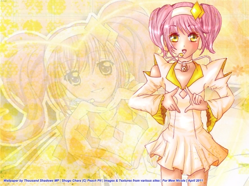 I used some textures for the background of this wallpaper. It turned out to be really bright and yellow. Well Amulet Dia is bright and yellow so it's a perfect fit. I faded another image of her in the background and it had a nice effect on the background. I found the image somewhere on the internet but I can't remember where. It took me awhile to extract it because it had a lot of intricate spots. I think it turned out ok though. I want to dedicate this to Mew Nicole in return for the lovely card she dedicated to me. I thought it was a beautiful card. Also I know you're a fan of Shugo Chara and I hope you like this wallpaper.