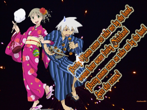 I took the picture for the background and the Maka and Soul Picture is form animepaper.