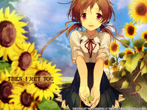 - akinashi yuu, clover, field, girl, scenic, sky, sunflower