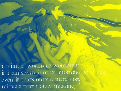 Uh, so this is my second entry for JanetChan's challenge {{VOCALOID}}. I chose Miku Hatsune's 'Last Night, Good Night'. Again, I don't really know what the song means, but I really like it. Miku Hatsune is my favourite character, closely followed by Megurine Luka. Hope you like the wallpaper ^^