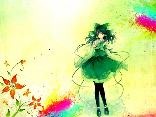 - blue, brown, flower, green, light, lines, orange, pink, red, Reimu Hakurei, Rin Hagiwara, Touhou, yellow