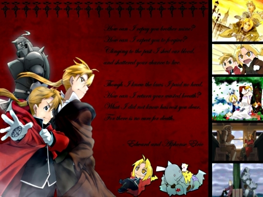 Edward and Alphonse Elric are brothers who stay by each others side no matter what. They Are bound by their blood and by their memories. These alchemist undeniably the greatest pair to reach our televisions.