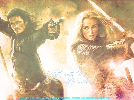 I made this wallpaper last night. This was mainly an experiment with blending techniques as I blended two separate images together of Will and Elizabeth. I added some textures which gave it a unique look and overall I'm very happy with it. I was originally going to have Jack Sparrow in this wallpaper as well but sometimes it's best to focus on other characters. I like Will and Elizabeth and think they are very cool characters. I'm a huge fan of Pirates of the Caribbean and they are my favorite series of movies. I'm hoping that a 5th POTC movie will come out. I've read rumors about it. I know they're not always to be trusted,but I can't help but hope there is one. I hope everyone enjoys the wallpaper. I love POTC!