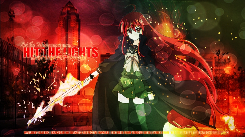 All I did was apply a few textures. I didn't want to go overboard this time plus I didn't want to distract from the image of Shana too much. The lyrics are from a song I was listening to while I created this wallpaper. The lyrics are from "Hit the Lights" by Selena Gomez. I just like the lyrics to this song and thought they fit this wallpaper. Dedicated to my amazing friend MangaKid. I hope everyone enjoys the wallpaper.